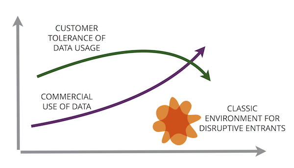 This cycle has a secondary engine whipping it along faster and faster: as we create better products the loyalty and trust of customers grows and their willingness to share ever more data increases. The implicit bargain that modern organizations are making with their customers is: “give me your data and we will give you delightful services.” Even if customers don’t explicitly state their acceptance of this bargain, their tacit acceptance of the deal drives the conventional wisdom that privacy is, to all intents and purposes, dead. For as long as we lap up ostensibly free services such as Gmail, Facebook and Dropbox, that are funded by the data and insights they can extract and sell to advertisers, there will be no impetus to search for an alternative to the conventional wisdom. Similarly we’re seeing frenetic competition to customize recommendations (and potentially pricing) for customers of retail, travel and media products.