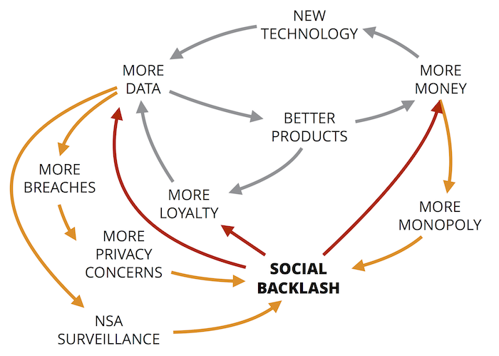 In fact this signal points to a turbulent eddy disrupting the virtuous cycle of our product and data economy. This turbulence is coming from a few different directions, but it’s combining to create the beginnings of what I would term a “big-tech backlash”. The more data organizations store the more they become a target for intrusion; the more high-profile breaches the more people worry about privacy concerns. As the data giants make more money their monopoly hold on the digital economy becomes clearer, again leading to public distrust. Added to all this you throw into the mix the wild-card of the revelations about dragnet NSA surveillance and you begin to see potent fuel for a public backlash against the direction that our data-driven digital economy is heading.